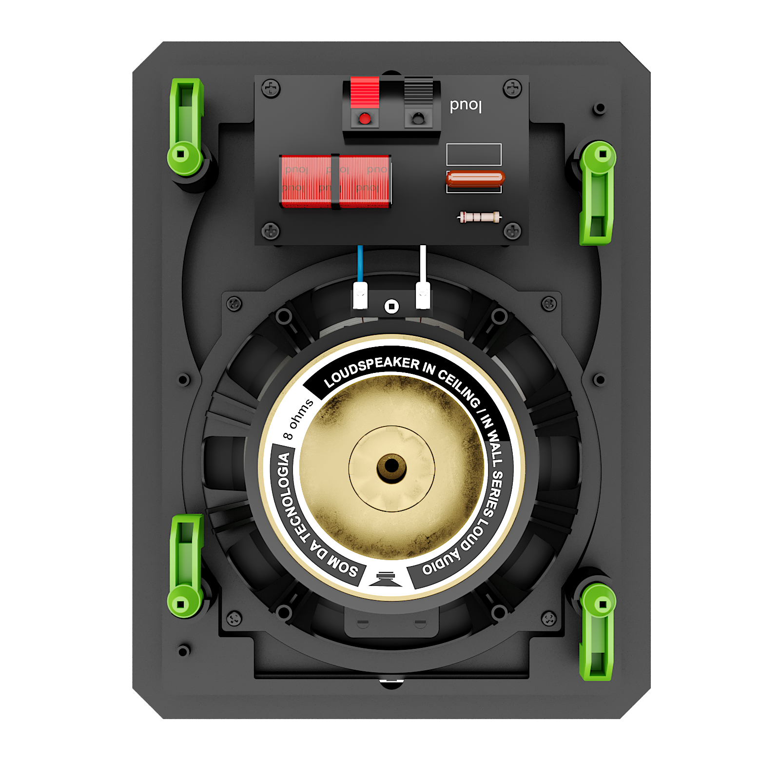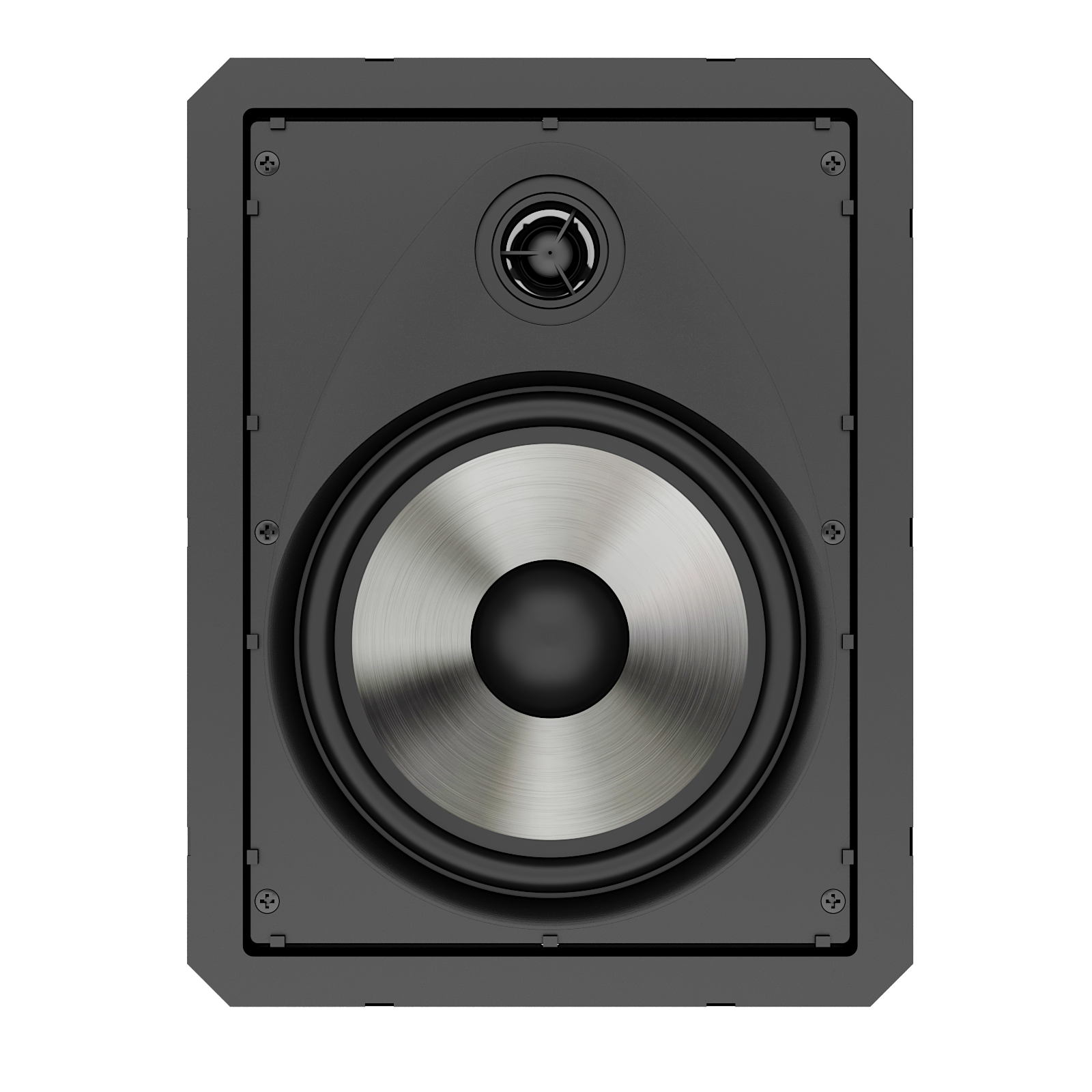 Caixa de 2 vias, sistema de montagem Baffle e Frame, tela frontal em alumínio microperfurada com pintura eletrostática em poliéster, exclusivo divisor de frequências, com corte de altas frequências em -3 dB e também de médias frequências em 12 dB/Oitava – woofer de 6″ com cone PP Metalizado Titanium, tweeter pivotante de 3/4″ com pastilha de neodímio e membrana de policarbonato.